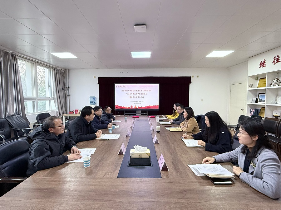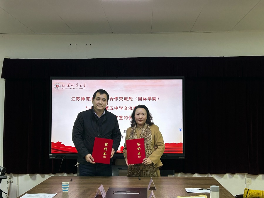 1月15日下午,我校国际处(国际学院)与徐州市第五中学交流座谈会暨合作协议签约仪式在泉山校区33号楼210会议室举行。徐州市第五中学校长马军营等一行与国际处(国际学院)相关负责同志参加。国际合作交流处副处长李丹主持会议。