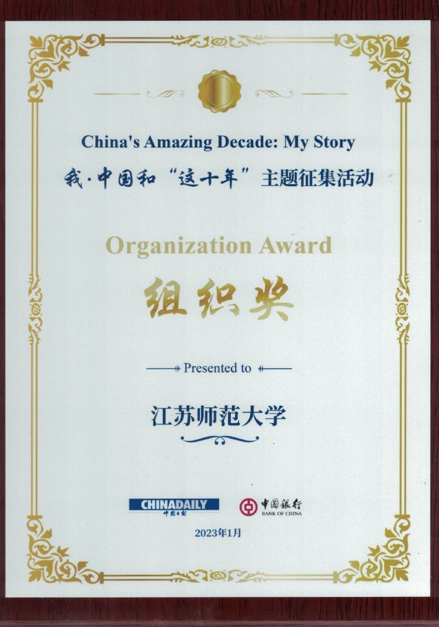 2022年,为迎接党的二十大胜利召开,展示新时代十年的伟大变革和中国式现代化的发展成就,展现可信、可爱、可敬的中国形象,中国日报社与中国银行合作,面向海内外的外籍人士举办“我·中国和‘这十年’”主题征集活动。本次活动共收到469件图文和视频作品,经过三轮评审,评出一等奖5名,二等奖10名,三等奖15名,优秀奖30名和优秀组织奖30名。我校积极组织在校外籍人士参加,在此次活动中荣获优秀组织奖。 (一审:吴眈,二审:陈扬,三审:张蓊荟)